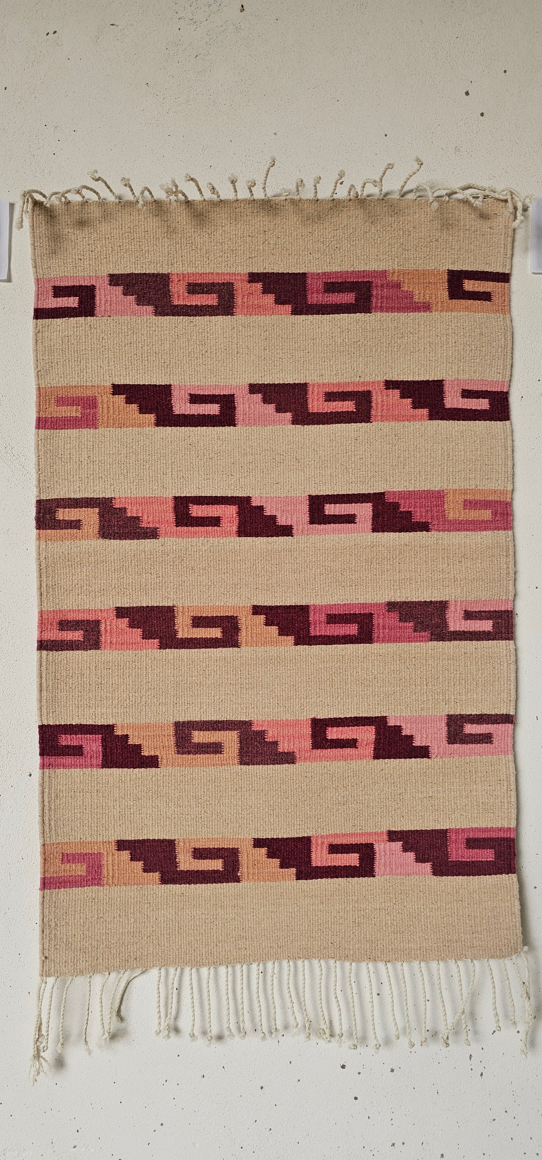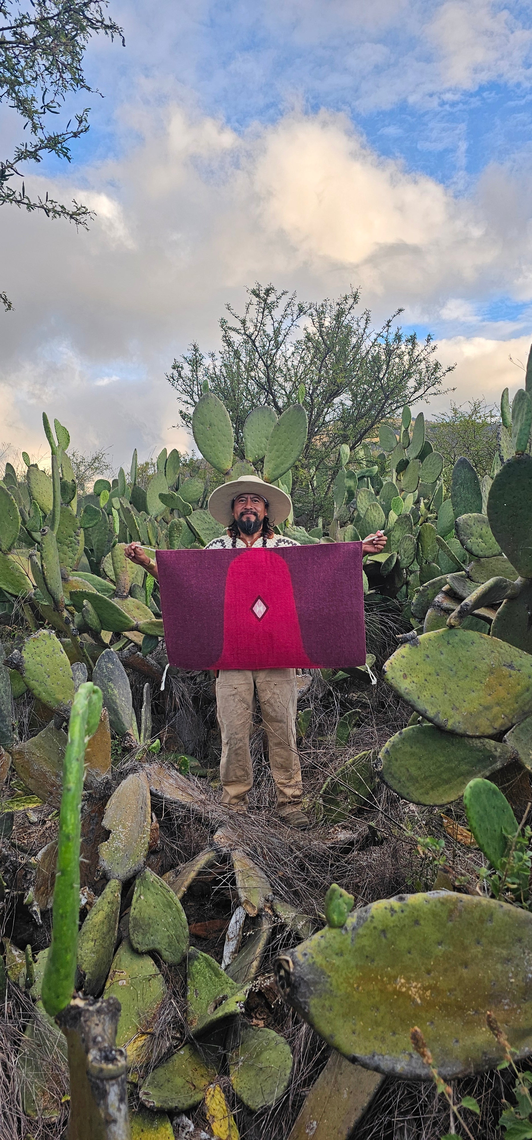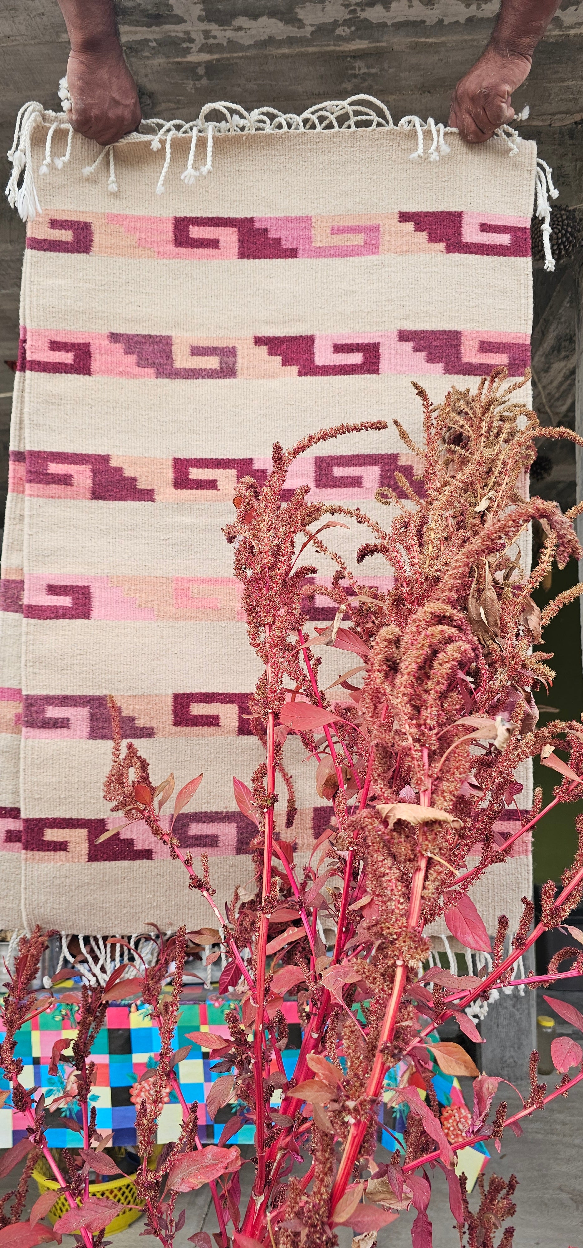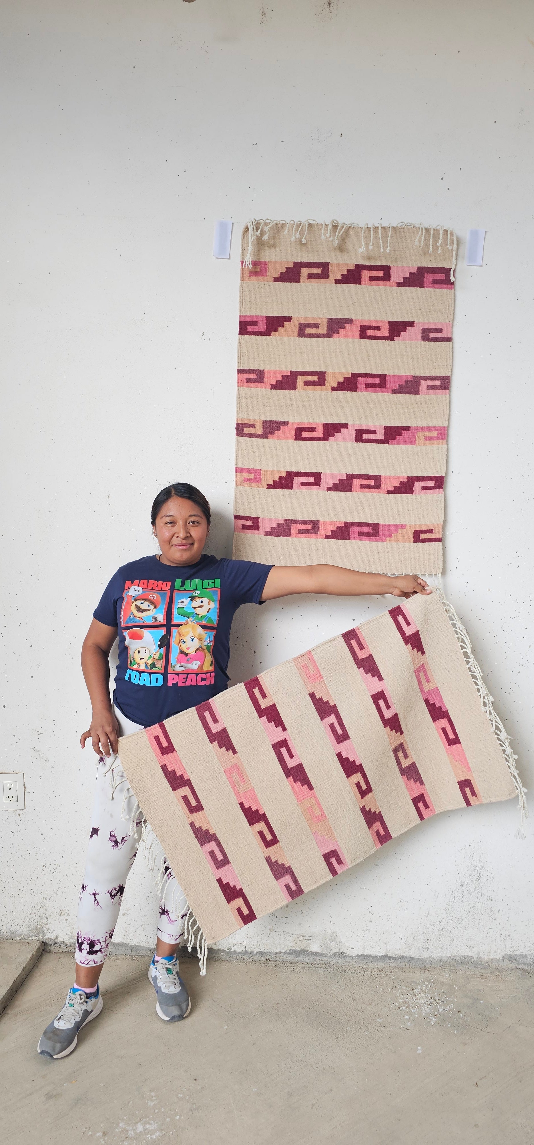 Size: 60x100cm; 2x3ft Weaver: Cristina, San Miguel del Valle Price: 150 USD Materials and methods: criollo sheep wool dyed with natural dyes: Beè (Dactylopius coccus Costa, cochineal), Yauhtli (Tagetes Lucida)...