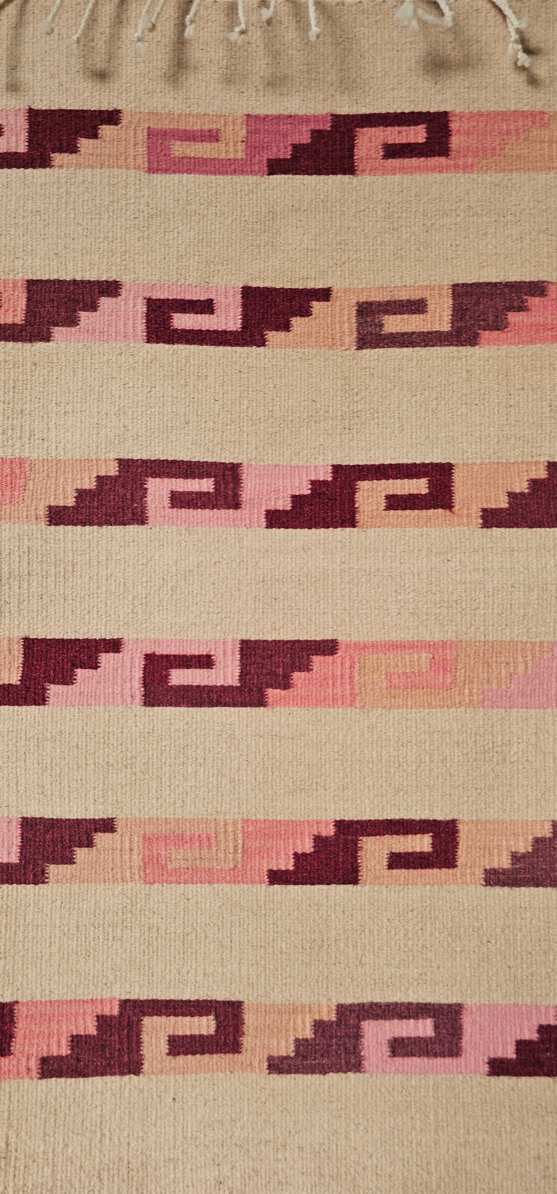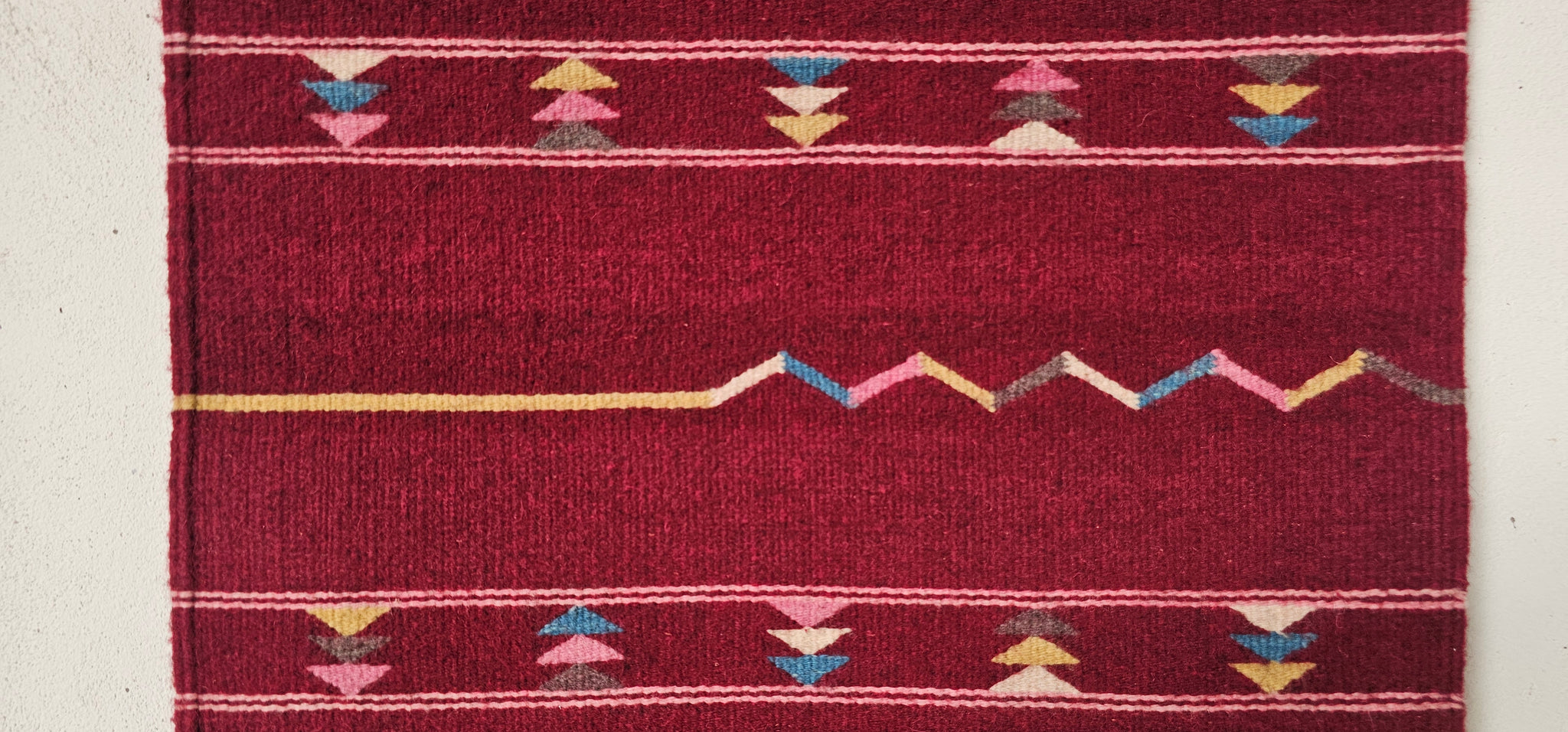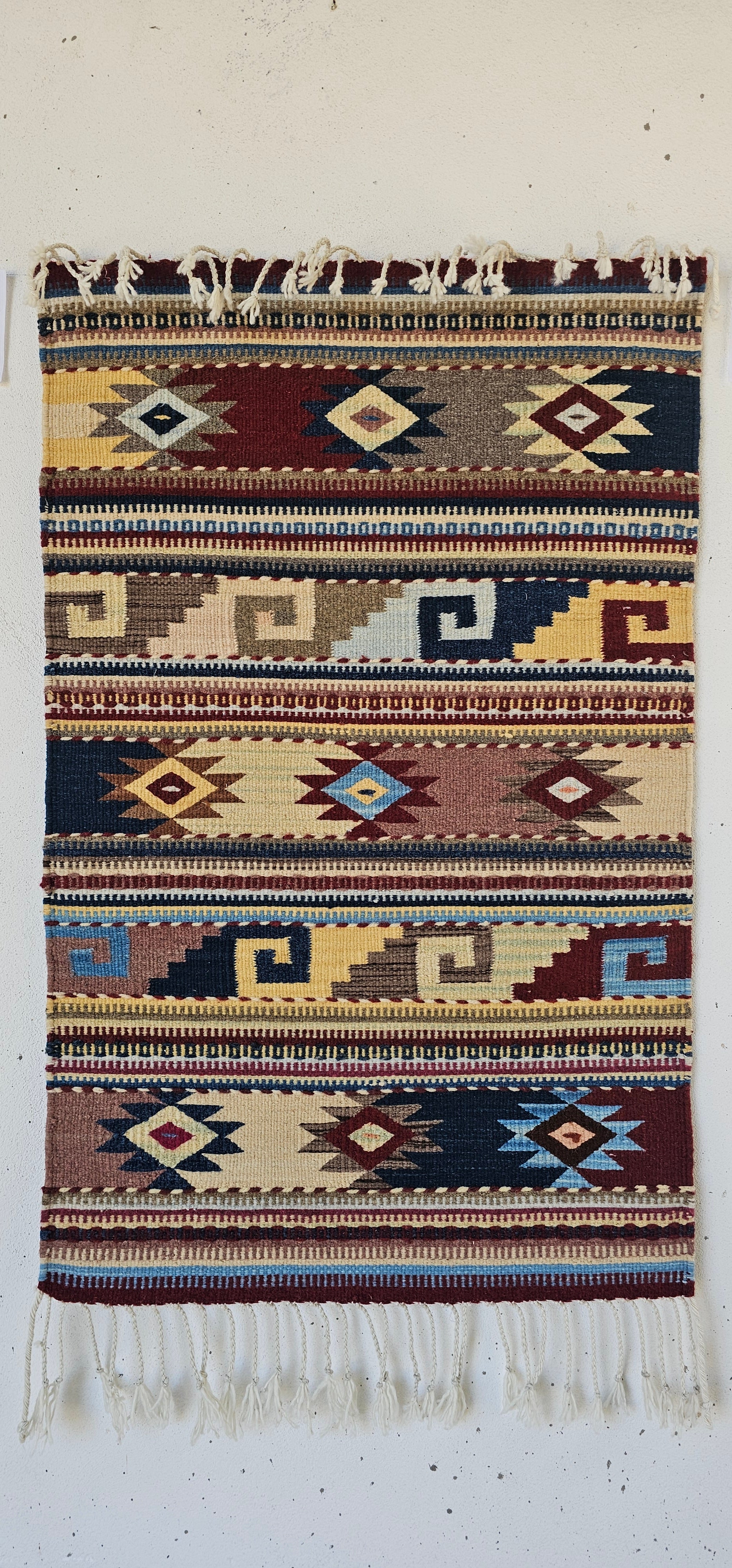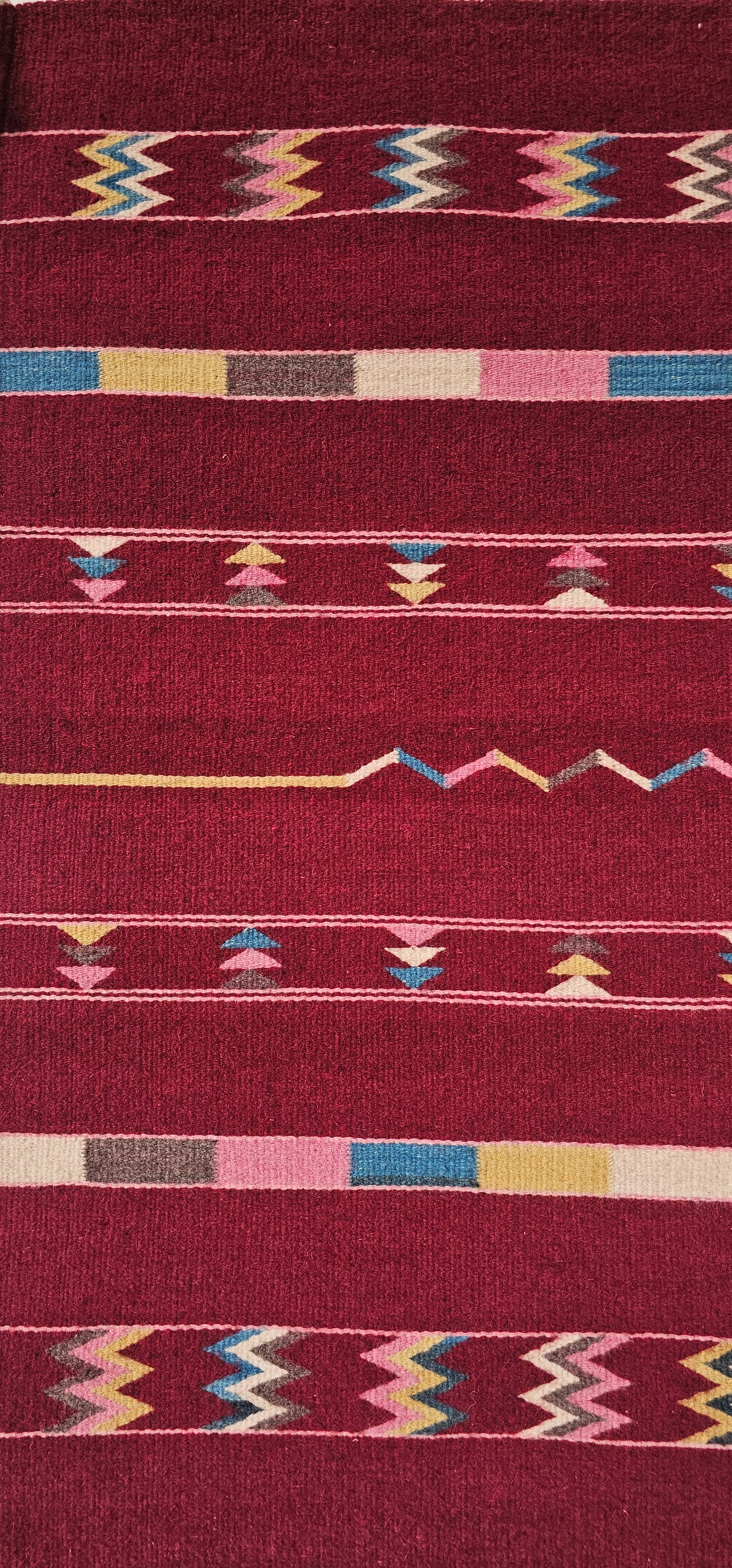 Size: 60x100cm; 2x3ft Weaver: Cristina, San Miguel del Valle Price: 150 USD Materials and methods: criollo sheep wool dyed with natural dyes: Beè (Dactylopius coccus Costa, cochineal), Yauhtli (Tagetes Lucida)...