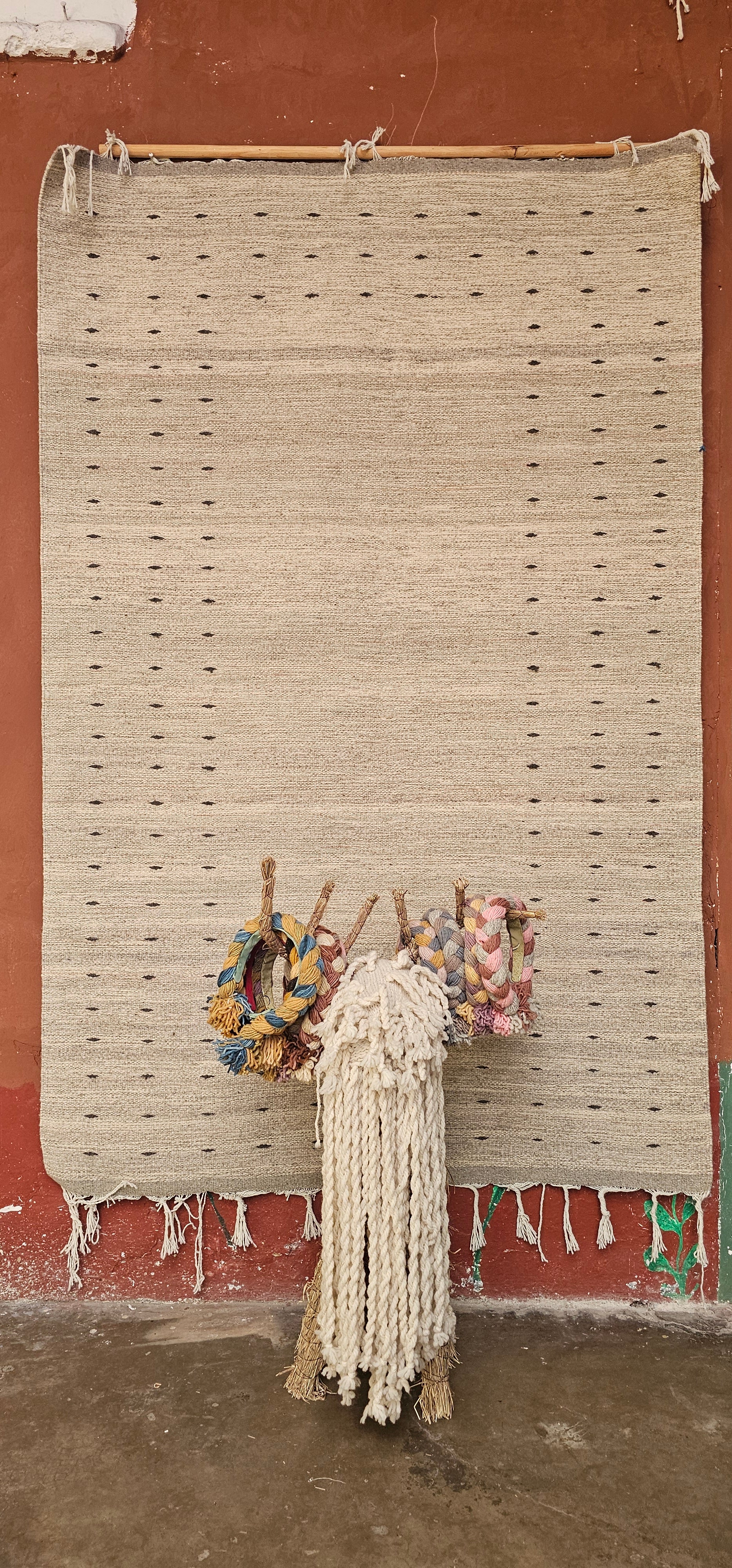 Size: 130x200cm; 4.2x6.5ft Weaver: Perfecto Bautista Martínez Materials ans methods: criollo sheep wool in its natural color for the background and hand dyed with colorfast aniline dyes using an exhaustive...